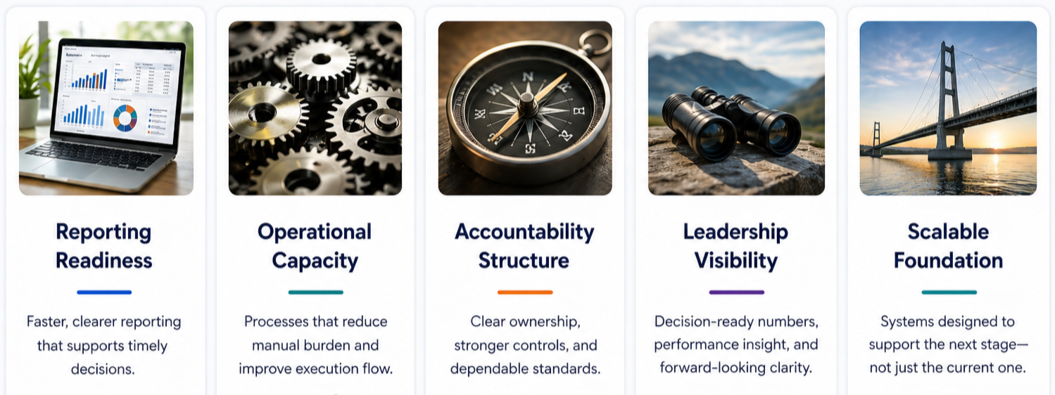 Common Growth Stages We Support: Nonprofits expanding programs or funding sources ○ Publicly funded organizations managing new obligations ○ Multi-entity organizations increasing complexity ○ Growth-stage companies scaling operations rapidly ○ Leadership teams preparing for the next level of scrutiny